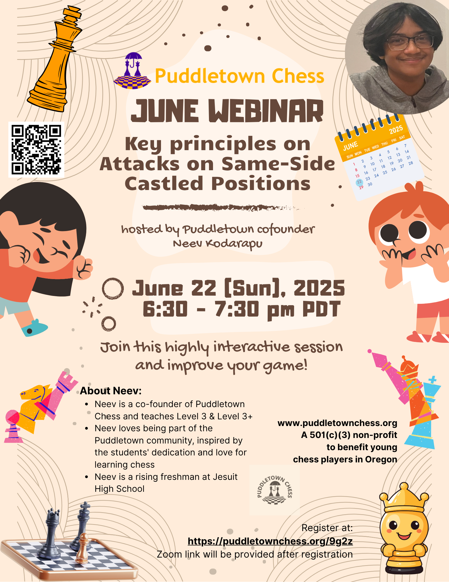Welcome to Pudddletown's 2025 June Webinar hosted by co-founder Neev Kodarapu. During this highly interactive session, Neev will share these key strategies to help our young chess players improve their game:
